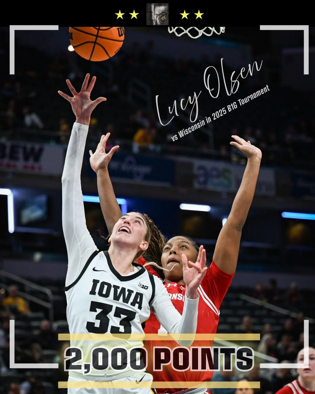 Lucy Olsen scored 19 points in Iowa’s 1st round win over Wisconsin in the 2025 TIAA Big Ten Women’s Basketball Tournament. However, it was her 9th point that put her in the 2,000 career points club. Olsen transferred to Iowa from Villanova during the 2024-25 off season. 1,504 of her 2,010 current career points came while attending Villanova.
